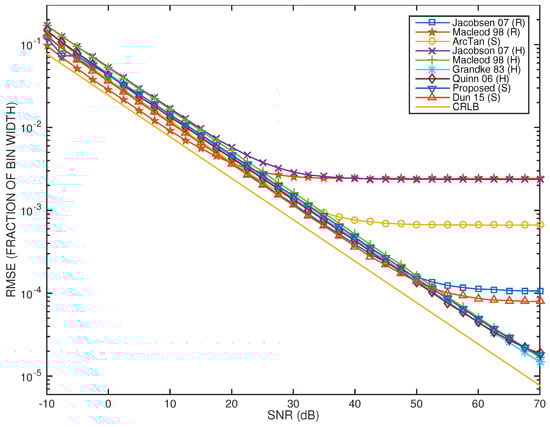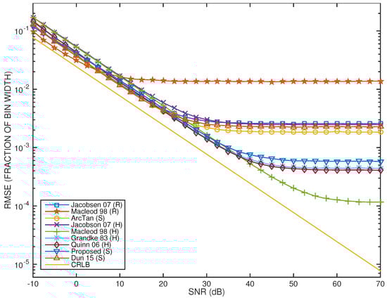 Figure 8: the Jacobsen07(H) estimator, the ArcTan(S) estimator, and the Jacobsen07(R) and Dun15(S) estimators. A third trend groups the Quinn06(H), the Grandke83(H), and the Proposed(S) estimators, whose RMSE performances saturate around 0.04% of the DFT bin width for SNR > 40 dB. Finally, the Macleod98(H) estimator is able to follow the CRLB more closely for SNR > 40 dB. It is interesting to note that this estimator is one of the two estimators that are more distant from the CRLB for SNR < 20 dB, which suggests that a lower performance at low SNR is compensated by a higher performance at high SNR. This is also the case for the Macleod98(R) estimator, which approaches the CRLB closer than any other estimator when the SNR is less than about 5 dB.