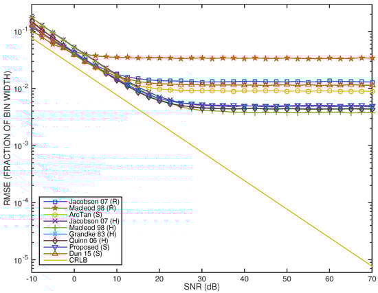 (i.e., 50% of the DFT bin width), that means that its performance is poor and non-accurate. On the other hand, if the corresponding RMSE is closer to the normalized CRLB bound, that means that its performance is closer to the ideal performance. The RMSE criterion will be used in