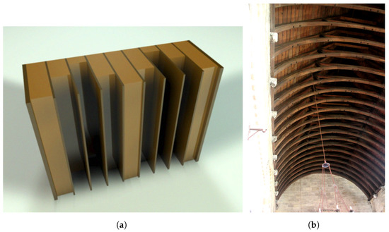 Examples of 1D scatterers. (a) One-dimensional acoustic diffuser. (Source: Musikproducer, CC BY-SA 4.0 https://creativecommons.org/licenses/by-sa/4.0 (accessed on 18 October 2023), via Wikimedia Commons). (b) Truss on church ceiling. (Source: Storye book, CC BY 4.0 https://creativecommons.org/licenses/by/4.0 (accessed on 18 October 2023), via Wikimedia Commons).