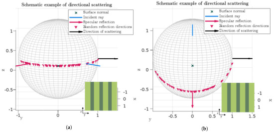 Illustration of possible reflection directions for an idealized 1D scatterer for incident rays parallel (a) and perpendicular (b) to the direction of scattering. Insets illustrate the orientation of the scatterer.