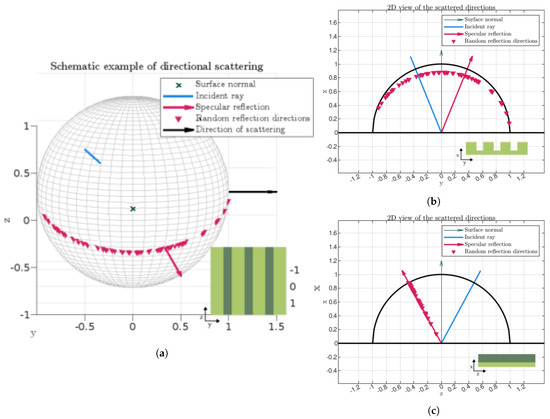 Some samples of possible ray reflections are shown in Figure 5. The incident ray directions are sampled from a subset of a diffuse distribution. This should indicate how the directional characteristics of the incident and reflected sound fields depend on the scattering algorithm used. In Figure 5a, there is no scattering, and the rays are specularly reflected. In Figure 5b, a fully diffused reflection model is used, and all directional characteristics of the sound field are lost. In Figure 5c, standard uniform scattering is used, and the reflected rays are either mirror reflections or fully random diffuse reflections as determined by the scattering parameter (s). In the last three plots (Figure 5d–f), the directional scattering algorithm is used. It can be seen that the acoustic energy is more dispersed in the direction of scattering. In Figure 5e, it can be seen that most rays continue to travel in the negative z-direction, thus maintaining a flow of acoustic energy in that direction.