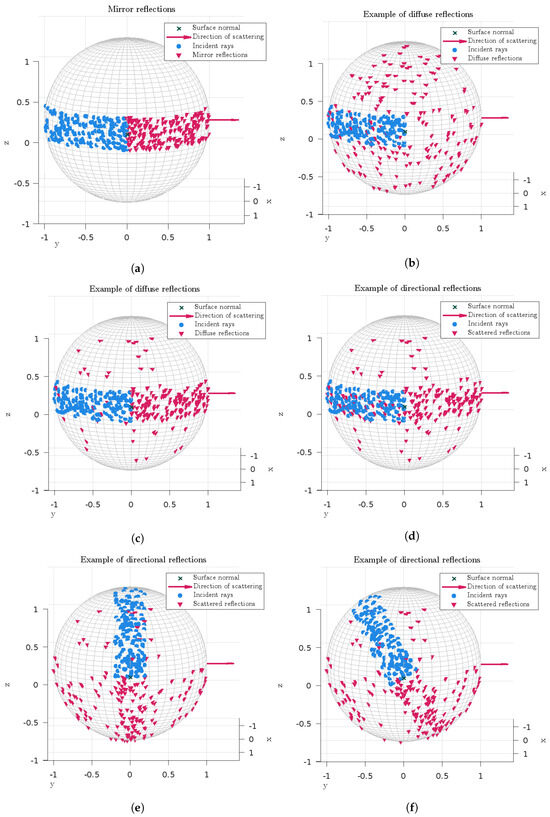 Illustration of some possible reflection patterns using the directional scattering algorithm. In (a), there is no scattering (), and all rays are specularly reflected. In (b), fully diffused reflections are shown (). In (c), the two scattering coefficients are equal to 0.2. This coincides with the standard uniform scattering algorithm with . In (d–f), examples of directional scattering are shown for changing direction of incidence. Here, , and .