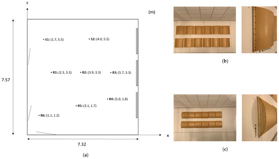 Figure (a) shows a sketch of the measurement space, and (b,c) show the scatterers used, oriented to scatter sound horizontally (in (b)) or vertically (as in (c)). The scatterers were mounted along the walls shown top and left in (a). An absorbent ceiling was mounted 2.7 m above the floor [20].