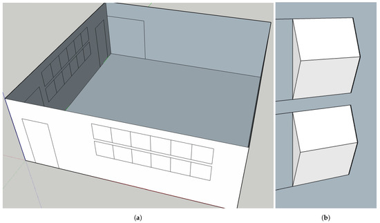 The digital model used for simulation of the measurement space. Compare to Figure 6. In (a), the model for the whole space is shown with the possible positions of scatterers marked, and in (b), the geometric model of the scatterers is shown.