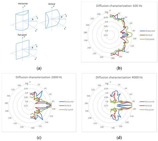Measured diffusion characteristics of the scatterers used in this project. Picture obtained from [22] with permission. In (a), the orientation of the scatterers are shown the different measurements. The diffusion characteristics are shown for each orientation in (b–d) for frequencies 500 Hz, 2000 Hz and 4000 Hz respectively.