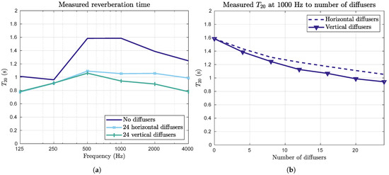 The plotted results, in Figure 9, indicate that the number of scatterers and their orientation had a significant impact on the reverberation time (). In Figure 9a, the average measured reverberation time using no scatterers, and 24 horizontal and 24 vertical scatterers is shown. In Figure 9b, the reverberation time at 1000 Hz is shown for an increasing number of scatterers. It is clear that the introduction of scatterers led to a reduced reverberation time (which is consistent with previous research [7,29,30]) and that the reverberation time was further decreased when more scatterers were added.