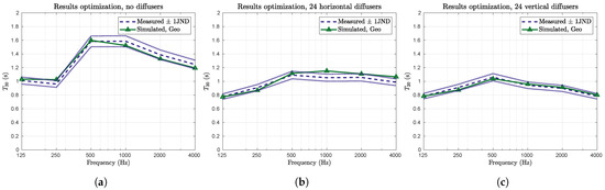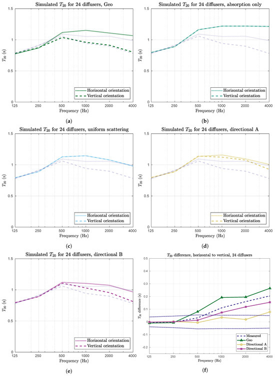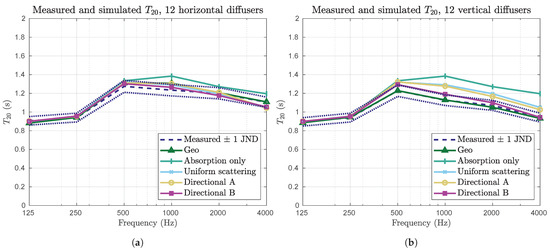 The measurements were compared to the simulation results from the five scattering models described in Section 3.2. In Figure 11, the averaged reverberation time for simulations and measurements using 12 horizontally (Figure 11a) and 12 vertically (Figure 11b) oriented scatterers are shown. As expected, the different simulation setups performed differently. In particular, the Geo model matches the simulation results better than the others. This was expected, since it was used for parameter optimization.