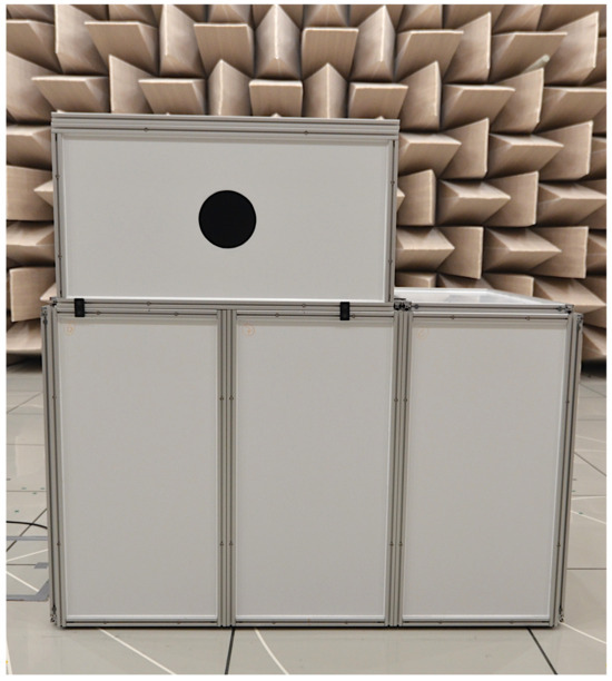 Figure 1 shows the model machine in configuration I with a circular opening in the hemi-anechoic chamber. Clearly, the opening represented a localized, well-defined and dominantly sound-radiating area (see the drawing (Figure A1) in Appendix A for the dimensions). Figure 2 shows a photo of the model machine in configuration II, which had a larger opening on the same side of the machine. This opening still represented a dominantly sound-radiating area (see the drawing (Figure A2) in Appendix A for the dimensions).