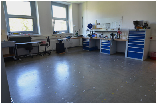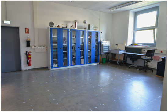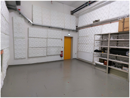 Figure 6 and Figure 7 show photos of the former reverberation room that was used as the second environment to investigate the accuracy of the amended and the non-amended standard. It had an “average” length of about 7.1 m, a width of 5.04 m and a height of 4.38 m. The shorter side had a length of 6.82 m and the longer side of 7.45 m, so the shape of the room was not rectangular (see Figure A3 in the Appendix A). It was no longer used as a reverberation room. Before mounting the absorbers, the room had a reverberation time of 1.6 s, which reduced to 0.52 s due to the absorbers.
