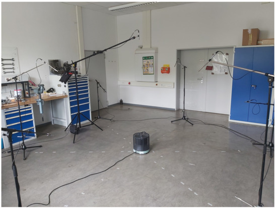 All the measurements were performed using a Brüel & Kjaer PULSE measurement system (Type 3660-D) with 28 channels (see Figure A4), which is calibrated by an accredited external laboratory every two years. Inside the Type 3660-D measurement system there were five LAN-XI Data Acquisition Modules: one input/output module Type 3160 (4 Lemo input channels (frequency range up to 51.2 kHz), 2 generator output channels) and four input modules Type 3050 (6 Lemo input channels (frequency range up to 51.2 kHz)). The sound pressure levels were measured using 8 Brüel & Kjaer Type 4190 1/2-inch free-field microphones (IEC 61672 class 1, Sensitivity: 50 mV/Pa, Frequency: 6.3 Hz–20 kHz, Dynamic Range: 14.6–146 dB), each connected to a Brüel & Kjaer Type 2669C pre-amplifier. The microphone calibration (field calibration) was conducted with a Brüel & Kjaer Type 4231 calibrator, which is yearly calibrated by an accredited external laboratory. The environmental conditions, i.e., static pressure, air temperature and relative humidity, were measured using an Ahlborn ALMEMO 2590-4AS and recorded for each measurement.