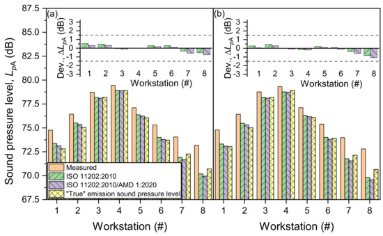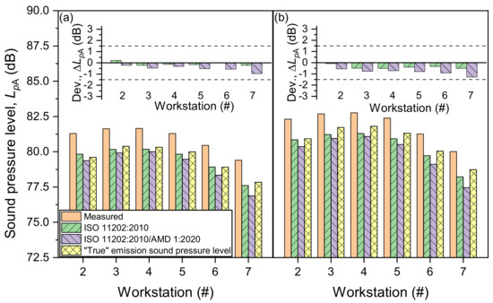 According to Table 1 in ISO 11202:2010 [2], accuracy grade 2 corresponds to and accuracy grade 3 to , respectively. Thus, the deviation between the “true” emission sound pressure levels of the workstations determined in the hemi-anechoic chamber and the emission sound pressure levels determined in situ, e.g., in the workroom studied in this paper, should not exceed the value of the standard deviation of reproducibility for the determined accuracy grade.