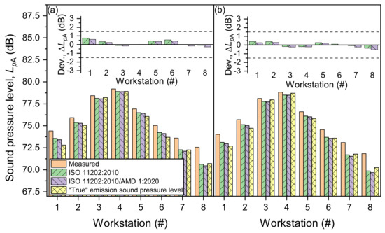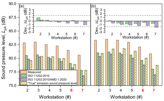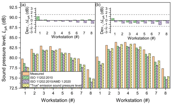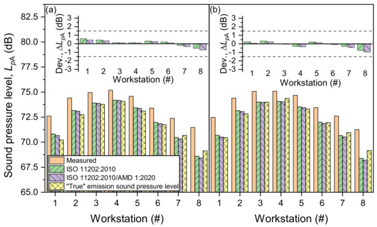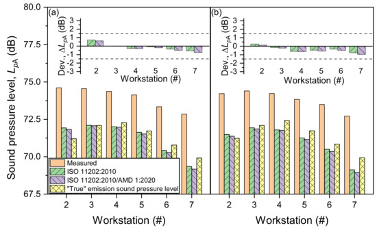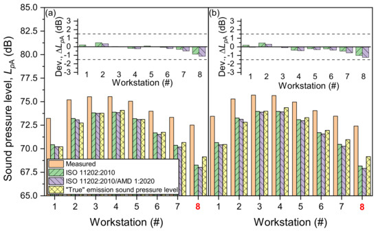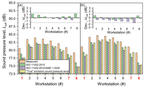 However, the deviations between the “true” and the determined sound pressure level increased compared to a distance of . Here, the maximum deviations between the “true” and the determined were slightly larger when using the amended standard [17]. The numbers of the workstations (eight at both heights) with accuracy grade 3 (see Equation (4)) are marked in red in Figure 10.