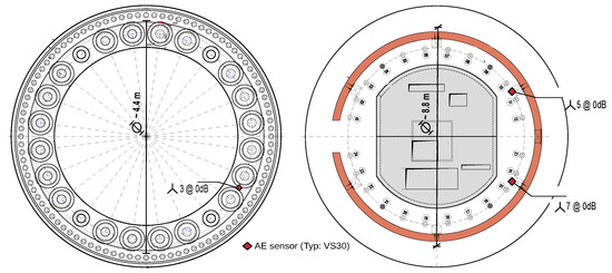 As part of a research project, we had access to a hybrid tower of an operating wind turbine with a hub height of approximately 142 m, in which we installed an AE measurement system with eight sensors. Four sensors (Model: Vallen VS30-SIC, Wolfratshausen, Germany) were installed on the transition piece at the top of the concrete part of the hybrid tower construction and another four sensors at the footing of the tower. Figure 1 depicts a cross-sectional view of the transition piece on the left and the footing on the right along with the positions of sensors that are later used for evaluation. In contrast to the laboratory experiments, described in the following sections, we here continuously recorded the environmental noise for a period of about one week. For all subsequent analyses and evaluations, we assume that no damage occured in the operating wind turbine within this period.