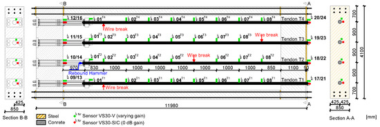 Figure 2. Technical drawing of the large-scale test frame with four post-tensioned steel tendons (T1–T4). The design of both anchor beams is based on a hybrid wind turbine tower construction. The anchor beam with the covering steel plate is considered to be a transition piece replica, while the other side’s design is meant to be a footing replica of such a hybrid wind tower. Both, the locations of the manually conducted wire breaks for each tendon and the sensor positions are highlighted. The AE sensors Acoustics 06 00011 i0011–8 were mounted on the tendon under test itself, so that these positions changed throughout the experiments as indicated by the superscripts (T2–T4). All other sensor positions remained unchanged. In this work, the sensors without preamplification (in red) mounted at the footing and the transition piece replica are in the focus of research.