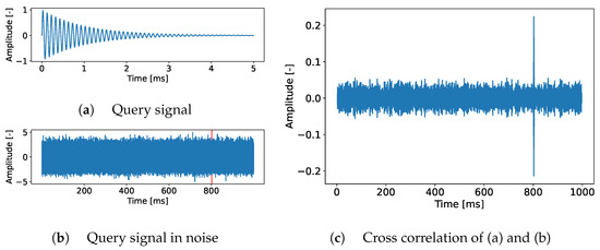 Figure 3. Toy example of a matched filter that detects a signal buried in noise. Subfigure (a) shows the query signal (an exponentially decaying sine wave with a frequency of f = 10 kHz), the signal in (b) is white noise drawn from a gaussian distribution N ( 0 , 1 ) with the query signal embedded at T = 800 ms (red shaded area). From (c), it becomes apparent how the cross correlation of (a,b) results in a signal with significantly higher SNR than signal (b), which allows for simpler detection.