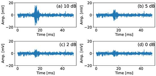 Figure 5. Example of a wire break signal from the laboratory experiments (Section 2.1.2) in an exemplary noise measurement recorded in the operating wind turbine (Section 2.1.1). The wire break signal is scaled to obtain the desired signal-to-noise ratios of (a) 10 dB, (b) 5 dB, (c) 2 dB and (d) 0 dB.