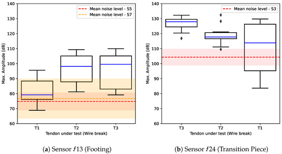 Figure 6. Distribution of max. amplitudes [dB] recorded on the outer most sensors on (a) the footing replica (sensor Acoustics 06 00011 i00113) and (b) the transition piece replica (sensor Acoustics 06 00011 i00124). The abscissa of the boxplots denotes, on which tendon the wire breaks were conducted. From left to right, the distance between wire break source and the anchor beam as well as the distance of the sensor to the anchor point of the tendon under test increases (see also Figure 2). The dotted lines and shaded areas indicate the mean noise amplitude and the 2 σ confidence interval (assuming normally distributed noise) from Table 2, respectively.