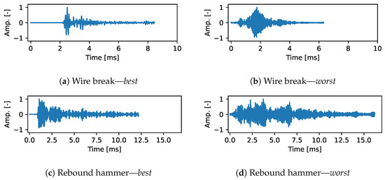 Figure 7. Selected query signals from (a,b) laboratory wire break experiments and (c,d) rebound hammer tests at the test rig using the arg max - (best) and the arg min -function (worst).