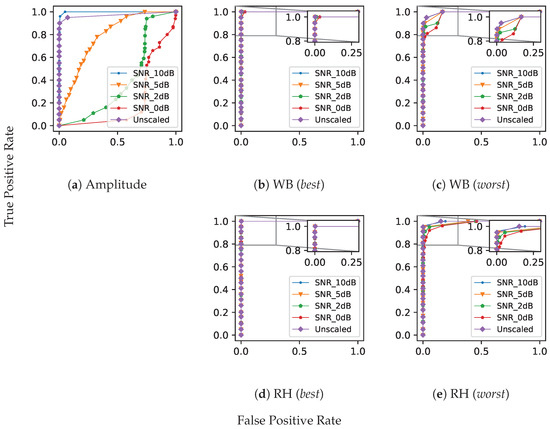 Even though we conducted those wire break experiments on a comparatively large test frame, laboratory experiments are somehow always limited to represent real structures or a part of it in a certain scale. Due to the observed damping behaviour even for these relatively short distances, we therefore scaled the dataset of wire breaks from the laboratory experiments according to Equation (8) and evaluated our matched filter for all these different signal-to-noise ratios. For completeness, the results of the unscaled version of wire breaks are provided as well. Figure 8 exemplary shows the ROC curves determined using one week of operational recordings from sensor Acoustics 06 00011 i0025 installed in the wind turbine tower and the wire break signals recorded at the footing replica of the laboratory test frame. The different subfigures depict the results for the different query signals shown in Figure 7 and selected as described previously.