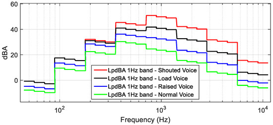 The spectrum considered for this work was characterized by octave bands depending on vocal effort (normal, raised, loud, and shouted voices) from 250 Hz up to 10,000 Hz. The power spectrum was normalized from the 1-octave band to the 1/3rd band and adjusted with the A-weighting curve. Figure 1 displays the four different 1/3rd octave frequency band A-weighted sound power levels of voices in the present research.