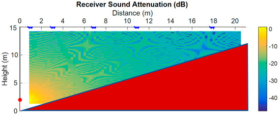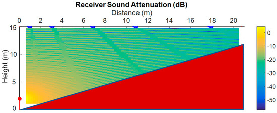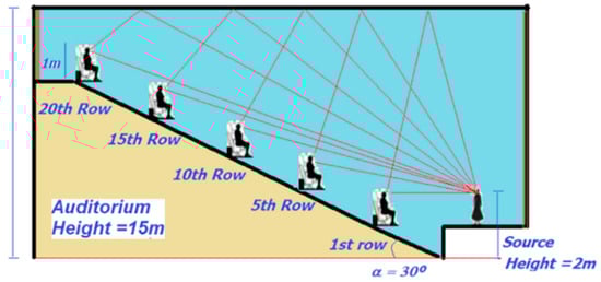 An auditorium model with an inclined floor of 30 degrees was considered, with a source over the stage at a 2.0 m absolute height, a maximum height of the ceiling of 15 m, and a spacing between the seat rows of 1.0 m. The received signal was monitored in five different seat rows, the 1st, 5th, 10th, 15th, and 20th, horizontally located at a distance of 1.73, 5.73, 10.73, 15.73, and 20.73 m from the source, respectively. The height of the receivers was fixed at 1 m from the floor.