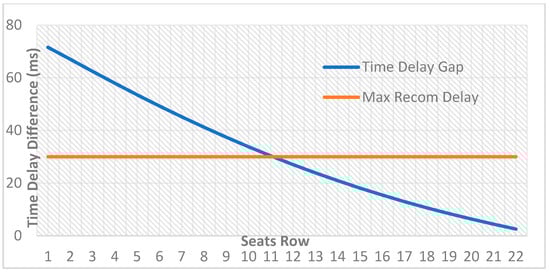 Theoretically, in the absence of any reflecting panel, and assuming ceiling specular reflection, the differences in the delay time between the direct acoustic path and the first reflected acoustic path for the scenario presented in Figure 3 would be greater than the maximum recommended delay of 30 ms if listeners were to be closer than the 10th–11th rows from the source (Figure 4).