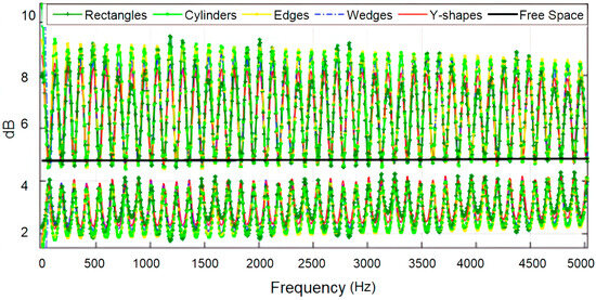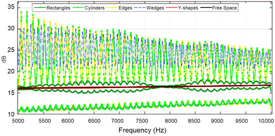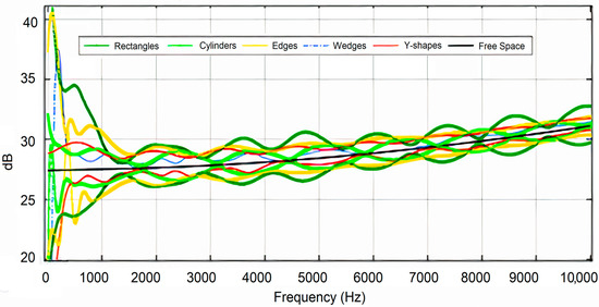 In Figure 13, Figure 14 and Figure 15, the attenuation fluctuations for all structures are clearly less than those in closer rows of seats (first and fifth), especially for higher frequencies, where the attenuation curves converge progressively toward the losses in free space. The diffusers increased their performance as absorbents, and the Y-shaped structures remained the best compared with the rest. Given the graphs presented, we can conclude that the best results for all rows of seats correspond to the Y-shaped diffusers since they provided the most similar behavior to an ideal free-space environment that does not show attenuation fluctuation. It is also visible that at the lower frequencies, the discrepancy in the losses in free space was more evident for all the designed diffuser models, although the Y-shaped diffuser maintained excellent performance at low frequencies, except for row 1 (although it was also the best of all diffusers). The standard deviation between the attenuation in free space and each diffuser for each seat row in Table 2 endorses the findings seen in previous graphs.