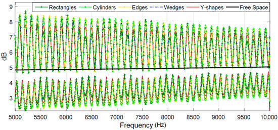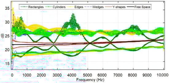 The substantial variation in the attenuation losses of certain structures (cylinders, edges, and wedges) for seat row 5 was also noticeable. Only rectangles and Y-shapes kept quite close to an ideal situation of perfect absorption; however, the Y-shaped structures kept showing the best performance in terms of acoustic attenuation.