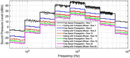 The spectrum of “shouted” voices in the five selected rows of seats, with Y-shaped diffusers, is quite similar to that which would be obtained with a clear propagation in free space (i.e., perfect absorption). We must emphasize that Figure 16 shows an acoustically pessimistic situation for the listener, which was just intended to evaluate the absorbent capacity of the diffusers. Multiple diffracting and reflecting echoes received from panels, floor, walls, and other structural elements were not considered. All these acoustic contributions would make the SPL significantly higher and the difference between seat rows also clearly lower, which is an essential advantage of indoor scenarios compared with outdoor ones.