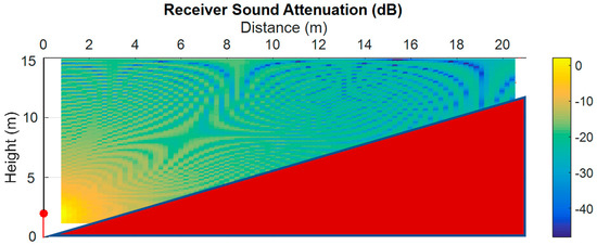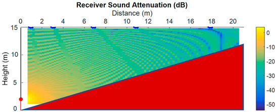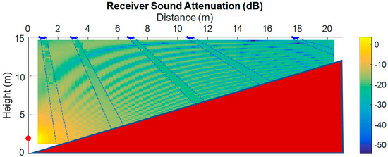 Together with the attenuation of each diffuser, the free-space attenuation of sound from the source to the listener, in the absence of obstacles, is overlaid. Perfect absorption by the diffusers would perfectly match the free-space propagation curve.