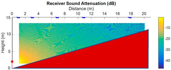 Acoustic attenuation maps were then simulated by positioning five equal structures of the identified best diffuser built with seven Y-shaped elements. The structures were optimally allocated on the ceiling to remove specular reflections from the transmitter up to the referred five-seat rows. The simulations are plotted at frequencies of 500 Hz, 1 kHz, 2 kHz, 4 kHz, 8 kHz, and 10 kHz in Figure 17, Figure 18, Figure 19, Figure 20, Figure 21 and Figure 22.