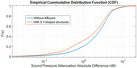 The structure with Y elements (Figure 5) has a weaker structural appearance than in other cases (with a thickness of w/2); however, there is no problem in increasing the thickness of the walls of the Y elements below their ‘V’ head (diffracting cap) because their acoustic performance will be the same. The wall thickness can only affect the absorption of waves passing through the wall as well as the phase of waves trapped between the gaps of adjacent walls. These sound waves follow paths that either do not reach the receiver or arrive very weakly, so their contribution is negligible compared with the diffracted signals at the diffuser heads.