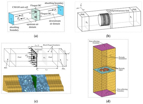 To validate the theoretical model or predict the STL of sound insulation metamaterials, the numerical FEM method is usually used, and most of the time, the commercial software COMSOL is chosen. Figure 1 gives the FEM model or illustration of the normal incidence STL prediction of different metamaterial unit cells [60,61,62,63]. The normal incidence excitation is applied, and the finite element models of sound insulation components, incident, and reflected acoustic fields are built. Two ends of the model are set to sound absorption boundaries, non-reflective boundaries, or perfectly matched layers (PML). Since metamaterials are periodic, corresponding periodic boundary conditions can be set to simulate the large-size structure.
