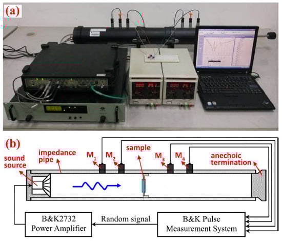 Figure 2. Illustration of STL measurement through impedance tube, reproduced from [68]. (a) Photo of the measurement set-up. (b) Sketch of the measurement set-up.