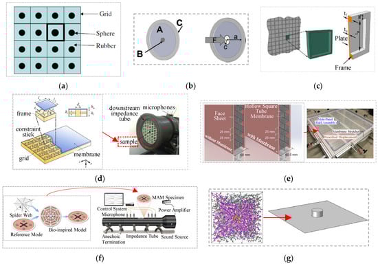 Figure 4. Classic and complex membrane-type metamaterial. (a) Schematics of the locally resonant metamaterial samples, reproduced from [77]. (b) Membrane-mass schematic with support ring, reproduced from [79]. (c) Cellular panel with its unit cell and a cutaway view, reproduced from [81]. (d) Unit cell of constrained membrane-type acoustic metamaterial and a photograph of the experimental setup for STL measurements, reproduced from [60]. (e) 3D representation of the meta-panel without (left) and with (right) the membrane and in-house designed membrane stretching mechanism, reproduced from [82]. (f) Bionic design and test equipment, reproduced from [83]. (g) Particle-enhanced ethylene propylene diene monomer/ethylene tetrafluoroethylene and membrane-type acoustic metamaterials structure of particle reinforced polymer, reproduced from [84].