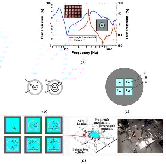 Figure 5. Multi-frequency membrane-type metamaterial. (a) Transmission spectra of a single circular cell (red curve) with an attached mass of 0.11 g and Sample-1 (blue curve) with an attached mass of 0.71 g, reproduced from [85]. (b) One ring mass and two ring masses: A, support structure; B, membrane; C, central mass; D, ring mass 1; E, ring mass 2, reproduced from [86]. (c) Schematic of the samples and the naming convention for the mass distribution of the four elements: A, support frame; B, membrane; C, attached mass, reproduced from [87]. (d) Various mass configurations on the membrane and producing the tensed membrane, reproduced from [88].