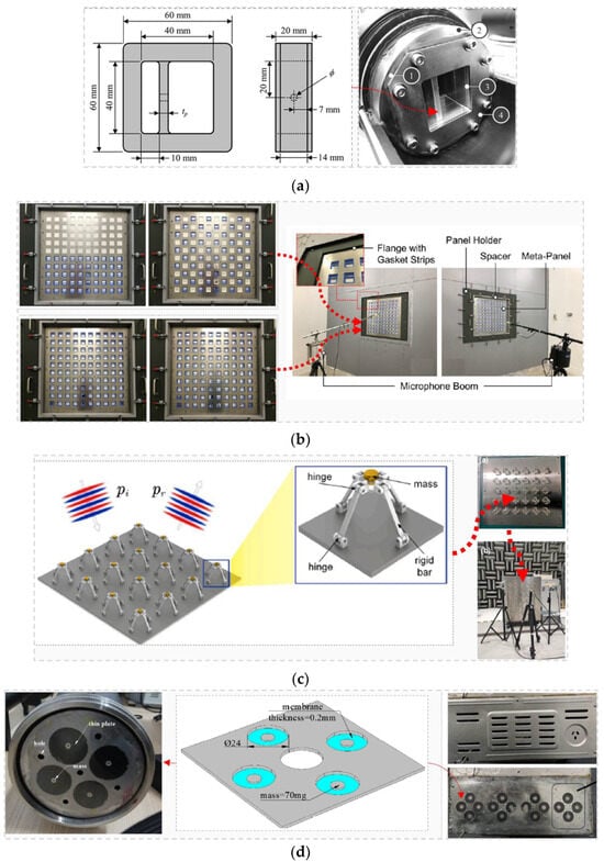 Figure 7. Other types of local resonance plate-type metamaterial. (a) Schematic representation of the specimen viewed from the front and the side and overview of the holder and the specimen mounted in the impedance tube, reproduced from [94]. (b) Setup of the different aluminum meta-panels and the setup for measuring sound pressure levels, reproduced from [95]. (c) Schematic of plane wave transmission through and close view of one single unit cell taken from the inertia amplification acoustic metamaterial plate, reproduced from [96]. (d) Test setup and specimen of the plate-type acoustic metamaterial and the back cover of the compressor compartment of a refrigerator with and without a perforated cover, reproduced from [97].