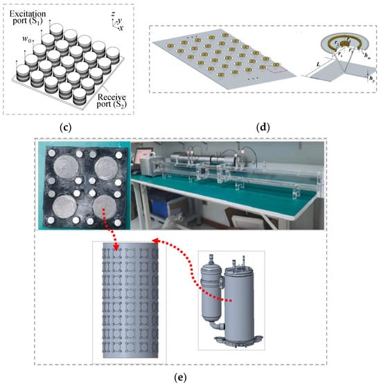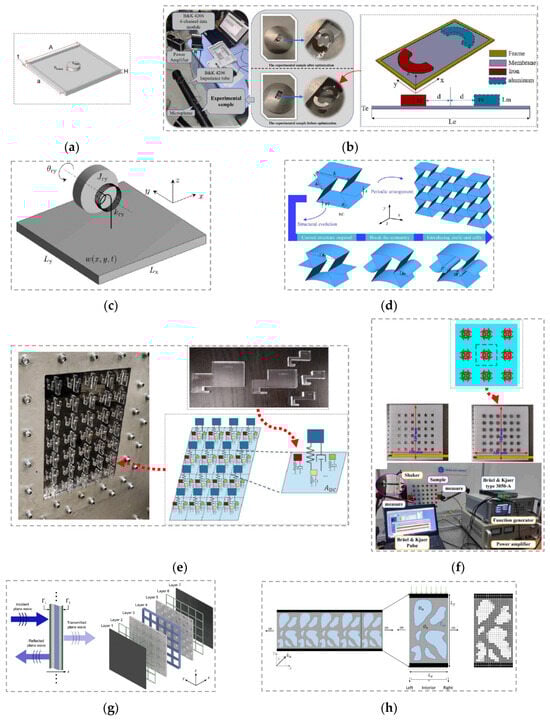 To broaden the sound insulation frequency band, dual-frequency and multi-frequency local resonance structures have been proposed. As shown in Figure 8a, de Melo Filho et al. aimed to attenuate the first-order acoustic modal response of the cavity structure, proposing to combine two differently tuned local resonant components in the same metamaterial panel to achieve multiple stopbands. The insertion loss of a thermoformed panel of size A2 (420 mm × 594 mm) was tested in a KU Leuven Soundbox. The results showed that the proposed thermoformed metamaterial panel had a similar weight to the original panel but achieved superior insertion loss in the stopband frequency range. The sound pressure level corresponding to the frequency of the first acoustic mode inside the cavity achieved an 8 dB peak reduction [100]. Langfeldt et al. researched the bandwidth improvement of plate-type acoustic metamaterials (PAMs) by using multiple masses or multilayers of PAMs stacked on each other in a unit cell, as shown in Figure 8b, using the modal parameters of the PAM unit cell and the transfer matrix method to predict the single layer and multilayer PAM STL. A large sample structure with a size of 1 m × 1.2 m, containing 180 cylindrical units, was tested between a reverberation chamber and a semi-anechoic chamber. The results showed that at 220 Hz and below, the test values were greater than the simulation results of the infinite period boundary, and other mid- and high-frequency infinite simulation results were in good agreement with the results of the finite test structure. Based on the particle swarm optimization algorithm, the sound insulation bandwidth of the structure between 100 and 400 Hz was optimized when taking the mass into consideration [63]. Zhou et al., by attaching multiple layers of paired rubber and metal cylinders to a thin plate, as shown in Figure 8c, showed that multiple bending wave band gaps in the low-frequency range could be obtained [61]. Dong et al. proposed a metamaterial plate with a double-mass membrane-type resonator (DMMR), as shown in Figure 8d. Combining polynomial fitting and virtual spring methods, the natural frequency characteristics of the resonator and the characteristics of the metamaterial plate were obtained, which showed multiple band gaps [101]. Li et al. proposed an acoustic metamaterial structure with a four-vibrator phononic crystal, as shown in Figure 8e. The semi-analytical method combined with finite element analysis was used to predict the sound insulation, and the single-cell crystal was tested through a square impedance tube. Finally, a cylindrical sleeve structure was designed for a rolling rotor compressor [102].