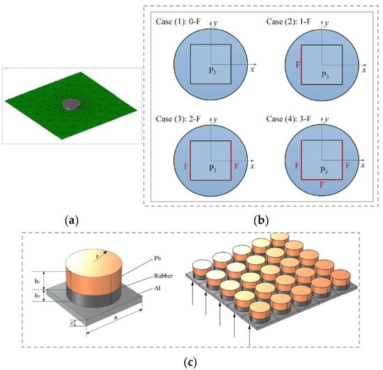 Figure 9. Boundaries and temperature research related to plate-type metamaterial. (a) Computational mesh for the metamaterial unit cell, reproduced from [62]. (b) Schematic diagram of thin plate type resonators with four boundary configurations, reproduced from [103]. (c) Schematic unit-cell of metastructure and the boundary harmonic loading direction of 5 × 5 finite structure, reproduced from [104].
