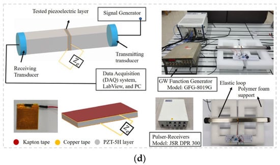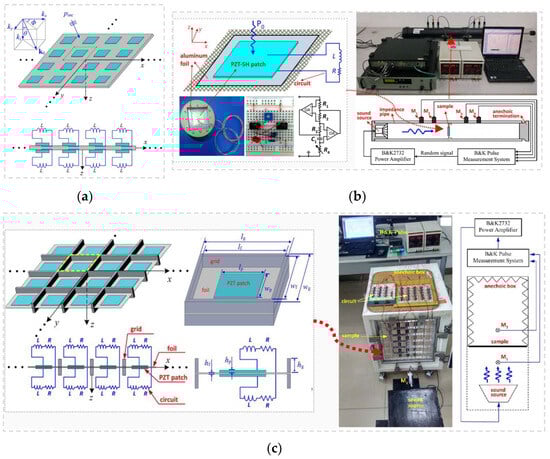 Figure 10. Classic piezoelectric plate-type metamaterial. (a) Schematic diagram and side view of the metamaterial thin plate with periodic arrays of shunted piezoelectric patches, reproduced from [114]. (b) Sketch of the smart acoustic metasurface, photo, and sketch of the experimental ~setup, reproduced from [68]. (c) Sketch of the tunable acoustic metamaterial panel, photo, and sketch of the experimental setup, reproduced from [115]. (d) Schematic test facility, fabricated piezoelectric layer, and supporting structures, reproduced from [116].
