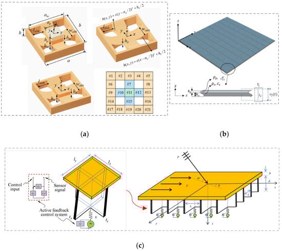 As shown in Figure 11a, Gao et al. designed a new perforated metamaterial plate composed of acoustic black holes (ABHs) interconnected with piezoelectric studs. Based on the differential quadrature element method and first-order shear deformation plate theory, the governing equations of the metamaterial plate were derived, and the results showed that the structure can manipulate bending waves to achieve broadband vibration absorption and directional wave propagation [117]. Schimidt et al. studied the vibroacoustic performance of gradient piezoelectric metamaterial plates, as shown in Figure 11b, through the electromechanical coupling of metamaterial plates. Gradients were achieved in the electrical domain through independent tuning of the resonant frequency of each unit. The effects of linearly varying gradients on vibration attenuation, sound power, kinetic energy, and sound radiation efficiency were studied. Gradient metamaterial plates outperformed their periodic local resonance counterparts in terms of vibration and radiated sound power attenuation [118]. He et al. proposed a metamaterial with active feedback-controlled elastic wave orthogonal stiffeners under external mean flow excitation, as shown in Figure 11c. The effective density was obtained through the effective medium method. Based on the Bloch–Floquet theorem and Poisson’s summations, the spatial harmonic expansion method of the virtual work principle was applied to STL. The effective mass density exhibited frequency-dependent characteristics, and the effective parameters and sound transmission of the structure could be adjusted through active feedback control and acceleration and displacement feedback control actions [119].