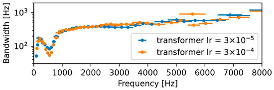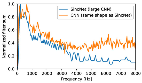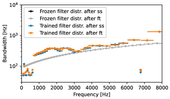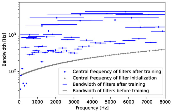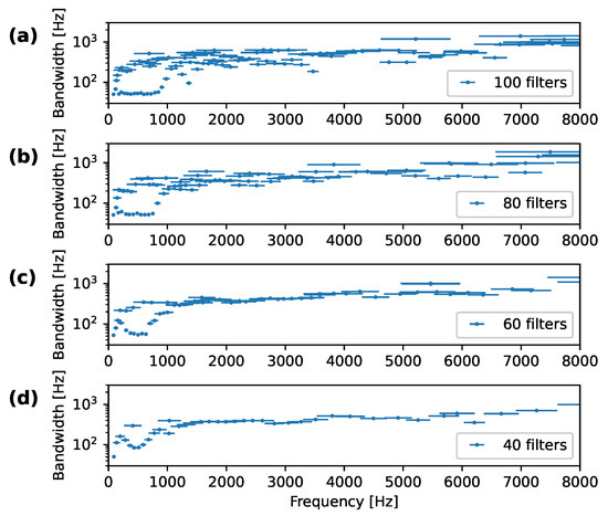 Figure 9 illustrates the structure that the filters learn when initialized to 100, 80, 60, and 40 filters. Globally, below 1 kHz, filters learn a very narrow-band frequency-specific filters, above 1 kHz, filters have a bandwidth around 400–500 Hz for all the different numbers of initialized filters. Compared to the previous work, below 1 kHz, the number of very narrow-band filters is much higher in this experiment.