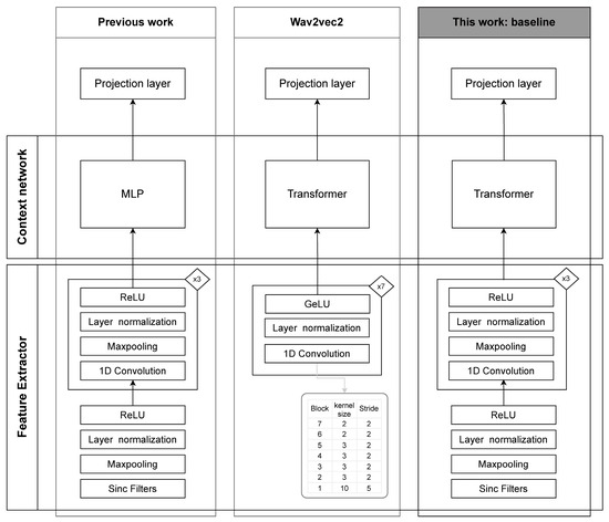 This can be tested by performing and comparing four experiments: The first experiment retrains the wav2vec2 encoder network from scratch to gauge its performance without the pre-training information, setting a baseline for encoder relearning while keeping the pre-training information of the context network. Second, we use the baseline CNN with a layer of the same size as the trainable filters to be comparable with Ravanelli and Bengio [54], but this time combined with a pre-trained context network. The third experiment consists of training a large SincNet encoder. The baseline CNN structure is combined with a layer of trainable filters and trained with the pre-trained transformers. Finally, we compare these experiments with a SincNet structure containing fewer CNN layers (than the structure used in the experiments of Section 4.1).