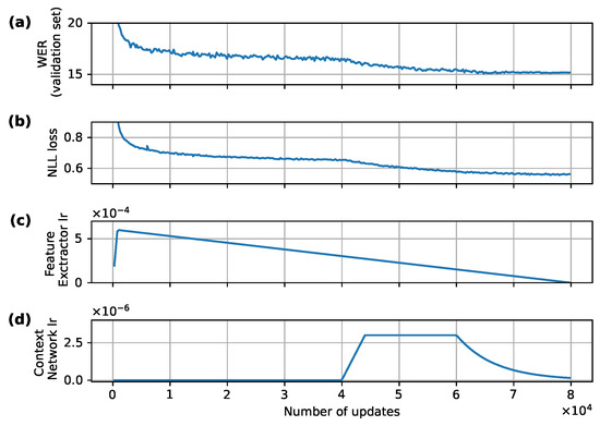 Training curve of the long-run training of 100 k updates. (a) depicts the WER of the validation set (dev-other), (b) contains the negative log likelihood of the loss, and (c,d) depict the learning rate evolution of the feature extractor and context network, respectively.