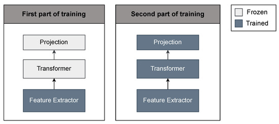 The original wav2vec2 implementation uses two types of learning rate schedulers: the polynomial decay and tri-stage learning rate scheduler. The polynomial decay scheduler is used for non-pre-trained network chunks; in the wav2vec framework, this corresponds to the self-supervision phase while the tri-stage learning rate scheduler is used for fine-tuning. For this experiment, the polynomial decay learning rate was assigned to the encoder network (Figure 3c), since this part of the network is replaced by a SincNet encoder and consequently trained from scratch in the experiment. For the context network, we created a hybrid version of the tri-stage learning rate scheduler incorporating a freezing period at the beginning (Figure 3d). The whole training scheme is schematically summarized in Figure 4, clearly depicting the two training phases. Freezing the transformers and projection layer in the first place avoids catastrophic forgetting of the transformer weights. Fairseq’s composite optimizer enables distinct learning rate schedulers for different model parts, utilizing a pass-through general optimizer to automatically associate each part with its specific scheduler and optimizer.
