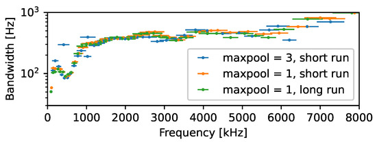 Comparison of filter distribution for different run lengths and internal SincNet structure. Using maxpooling within the filter structure makes some wide-band filters appear in low frequency ranges.