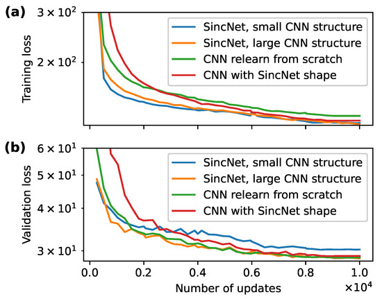 The convergence speed can be analyzed in the training curve. Figure 6 shows that in terms of training, the SincNet structure converges faster towards an equilibrium compared to a pure CNN structure.Concerning the validation, this is true in the very beginning, especially concerning the CNN with the same shape as SincNet (red curve) up to 2000 updates. We based our analysis of the convergence speed on the update metric to align the loss on the amount of data that go through a forward–backward pass. However, to be complete, Table 3 details the time that every experiment takes and the number of parameters that are contained in the front-end for purposes of comparison.