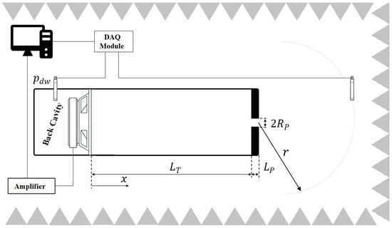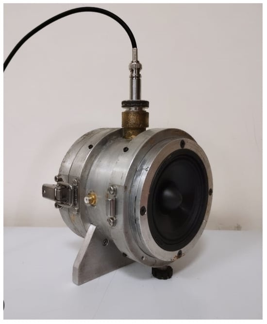 The measurement system was based on a National Instruments ADC NI PXIe-1073, Austin, TX, USA, Stati Uniti controlled by a LabView® VI, which commands the input voltage of the MESA® Power Booster V11 amplifier that feeds the speaker. A precise PCB Piezoelectronic® Model 377C20 condenser microphone, connected to the Microphone Preamplifier Model 426E01, was used for the measurements. Before each test cycle, the calibration of the ½-inch microphone was verified using a G.R.A.S. calibrator (114 dB @ 1000 Hz). This procedure allowed for precise determination of the microphone’s sensitivity, enabling accurate assessment of the acoustic pressure from the signal as picked up. The speaker velocity was derived from the acoustic pressure measured in the speaker back cavity [29,30]. Thanks to this method, the speaker volume velocity could be carried out with the measurement of the acoustic pressure in the back cavity of the speaker (Figure 5).