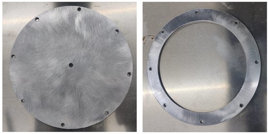 The experimental setup consists of an impedance tube with a diameter of 100 mm and a length of 410 mm (Figure 2). The sound pressure in the tube is generated by a loudspeaker Hertz HV100 of 100 mm diameter and a max power of 100 W. At the end of the impedance tube is a holed plate of 3 mm thickness with a diameter of 3 mm.The plate and flange are made of 3 mm thick aluminium and are held together by 8 M4 stainless steel threaded bars, as shown in Figure 3. Particular attention was given to ensuring that the orifice maintained a sharp edge during the fabrication process, as this is a crucial parameter for studying the onset of nonlinearities. The sharp discontinuity in the cross-section caused by the orifice played a key role in triggering nonlinear acoustic effects, while a smooth-edged orifice could introduce additional variables, such as an altered surface-to-fluid volume ratio, potentially leading to uncontrolled nonlinear phenomena. For the measurements, the tube was placed in a semi-anechoic chamber to avoid external interference and to replicate free-field conditions (Figure 4).