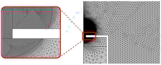 The numerical simulations were conducted using a finite element method to verify and validate the theoretical model developed based on the transfer matrix method. These simulations solve the wave equation in a coupled manner (neglecting thermal and viscous dissipative effects) within the fluid domain, which includes the tube and the external volume outside the hole, alongside the linearized Navier–Stokes equations within the fluid domain of the pore where thermoviscous losses are considered non-negligible (in Figure 6, the blue and the red domain, respectively). The axial symmetry of the problem was exploited to scale the geometry into a 2D axisymmetric model, significantly reducing the number of mesh elements and, consequently, the number of degrees of freedom (DoFs) to be solved compared to a 3D model [35,36]. At the boundary of the external domain, sufficiently far from the outlet hole (approximately 20 times the tube radius, ), a domain layer known as a Perfectly Matched Layer (PML) was implemented. This absorbing domain approximates the condition of the free field outside the hole, preventing any contribution from reflections of potential confining walls of the global domain.